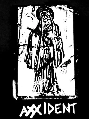 Black and white illustration of a saintly figure with a halo, standing with hands clasped, framed by an arch, with the word 'AXXIDENT' written below.