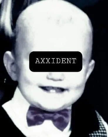 A young child with a shaved head, wearing a tuxedo and bow tie, with the word 'AXXIDENT' covering their eyes in a black bar.