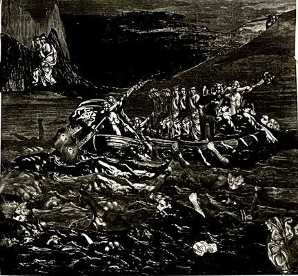 A painting depicting a boat with people navigating through turbulent waters, surrounded by skulls and bones, with dark, ominous background.